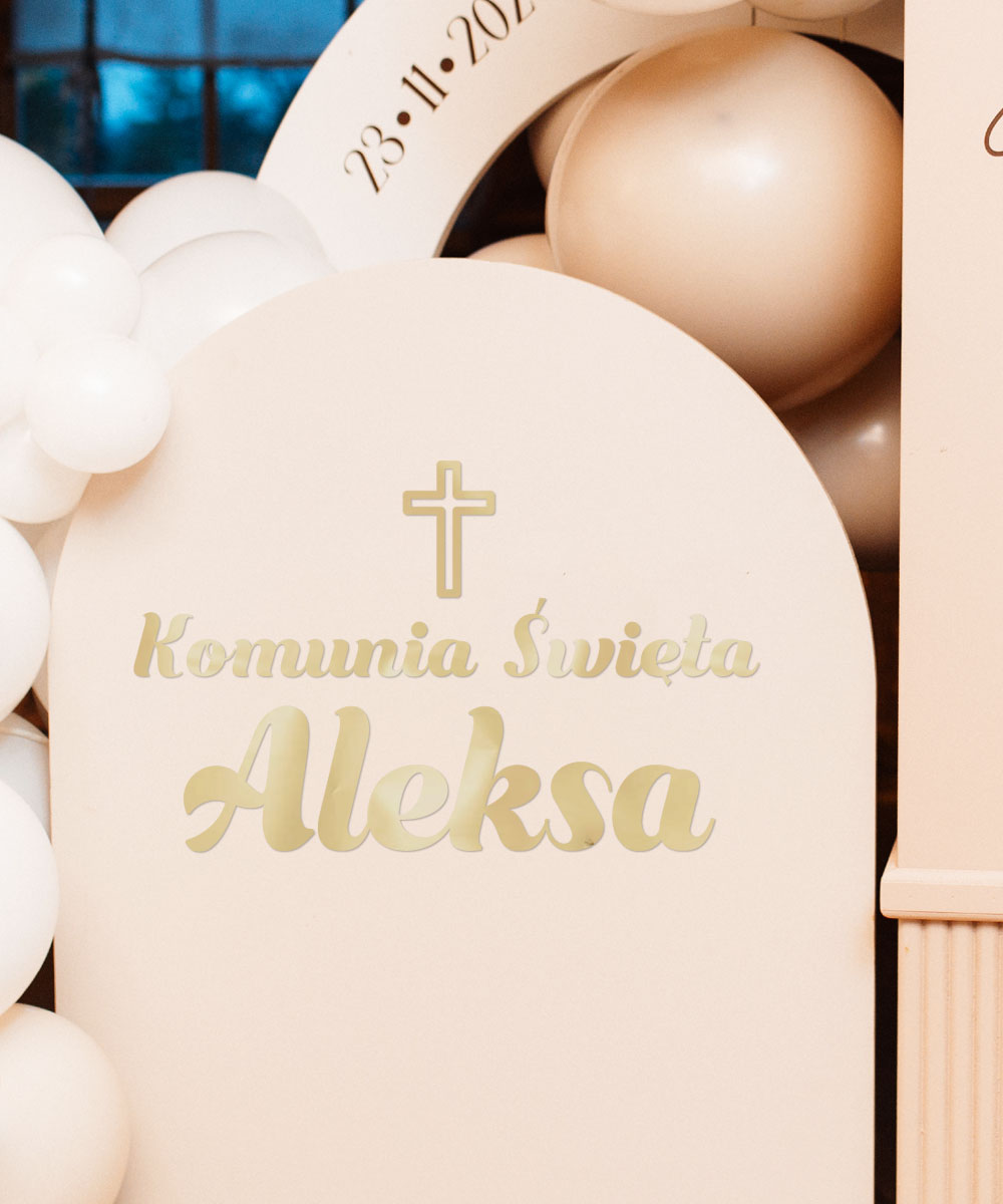 Dekoracja na komunię – napis na ścianę z imieniem. Stwórz niepowtarzalną atmosferę podczas Pierwszej Komunii Świętej dzięki eleganckiemu napisowi z imieniem. Idealny do dekoracji ściany, ścianki balonowej, lustra lub innej gładkiej powierzchni.